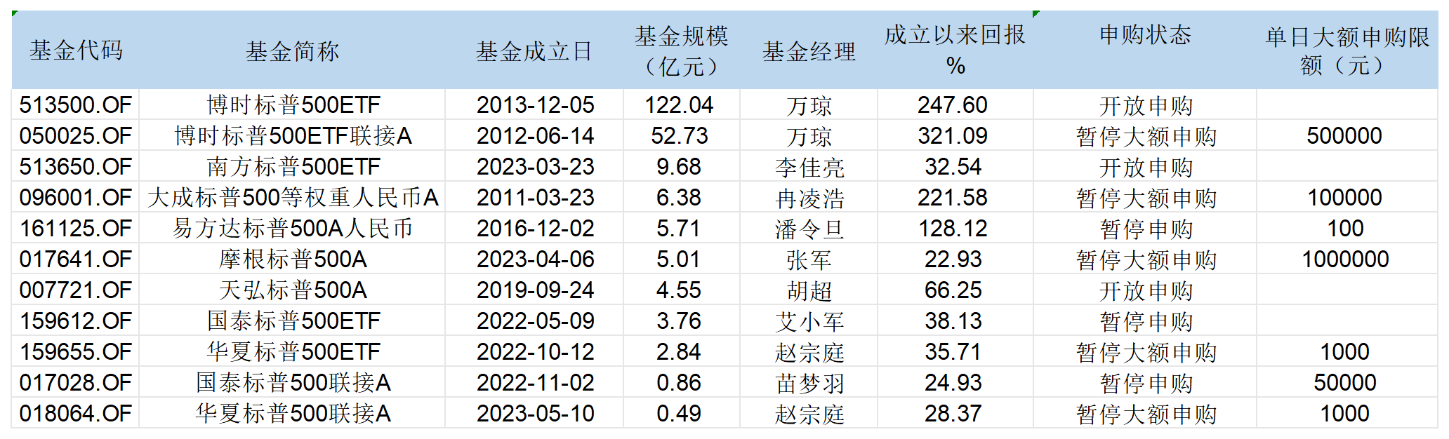 Wind数据显示,截至5月9日,市面上共有11只跟踪标普500指数的相关产品。其中成立最早的是大成标普500等权重人民币,成立于2011年3月23日,截至今年一季度末规模为6.38亿元。