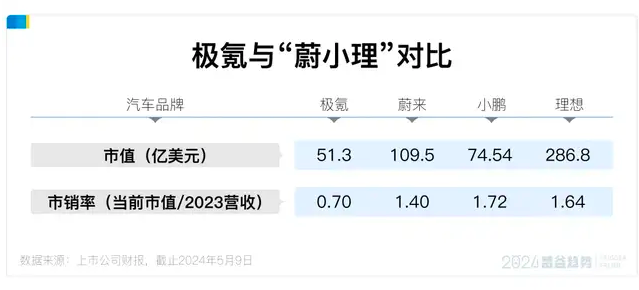 从市值来看,极氪大约相当于0.5个蔚来、0.7个小鹏、0.2个理想。