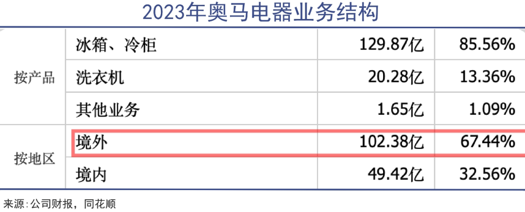 作为一出生就瞄准海外市场的奥马电器,其优势明显,海外收入占比一度高达80%,去年收购TCL合肥后增加了TCL冰洗业务,才导致境外收入下降到67%。