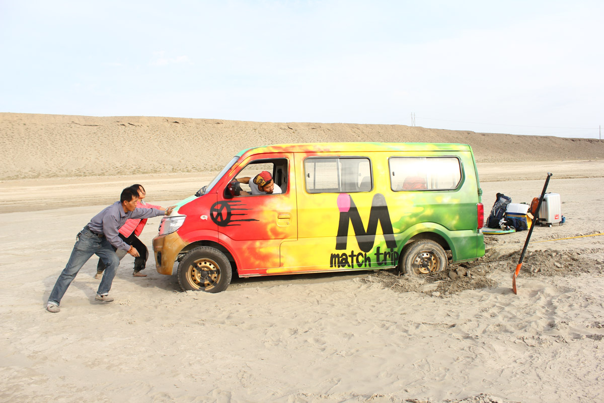 出了嘉峪关贝姨发现这是去年他们驻扎过一晚的荒地,远处有一汪想去没去成的水源,路牌写着这里叫黑山湖。为了完成去年的愿望,这次贝姨朝着湖水的方向开了过去。一开始都很正常,找到一处地面结实的地方停车,带着下水装备,四个人杀向湖水。水不是很温暖,近水的地方也从硬土地逐渐变成了泥巴,戏水体验感不佳,于是贝姨默默回到车上,准备沿着湖边寻找看有没有更好的地方下水。谁知道在他开出去没多远,车轮陷入了一片细沙中,他自己尝试了半个小时将车弄出无果,远处的老王看到情况前来,随后泓一和文森也先后来到车边,几个人再度尝试还是不行,求助路过的大叔也没法弄出面包车。最后打电话请来了救援车,持续努力至天黑,在救援车也不慎陷入沙土后,终于历经6个小时面包车重获新生,回到公路。