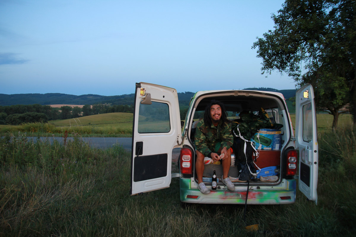 出境塞尔维亚,入境匈牙利后终于进入申根国,之前经历的被砸车事件终于得以在没有边境检查的自由中渐渐被忘记。穿越不同的申根国就像在中国穿越不同的省份一样无人阻挡,公路旅行也重新获得良好的体验,一路驶向Woodstock音乐节时不因时间而紧张,在一处捷克南部的小山坡上欣赏完日落、用完晚餐之后,余晖未尽,音乐响起,三人愉快地再次上路。