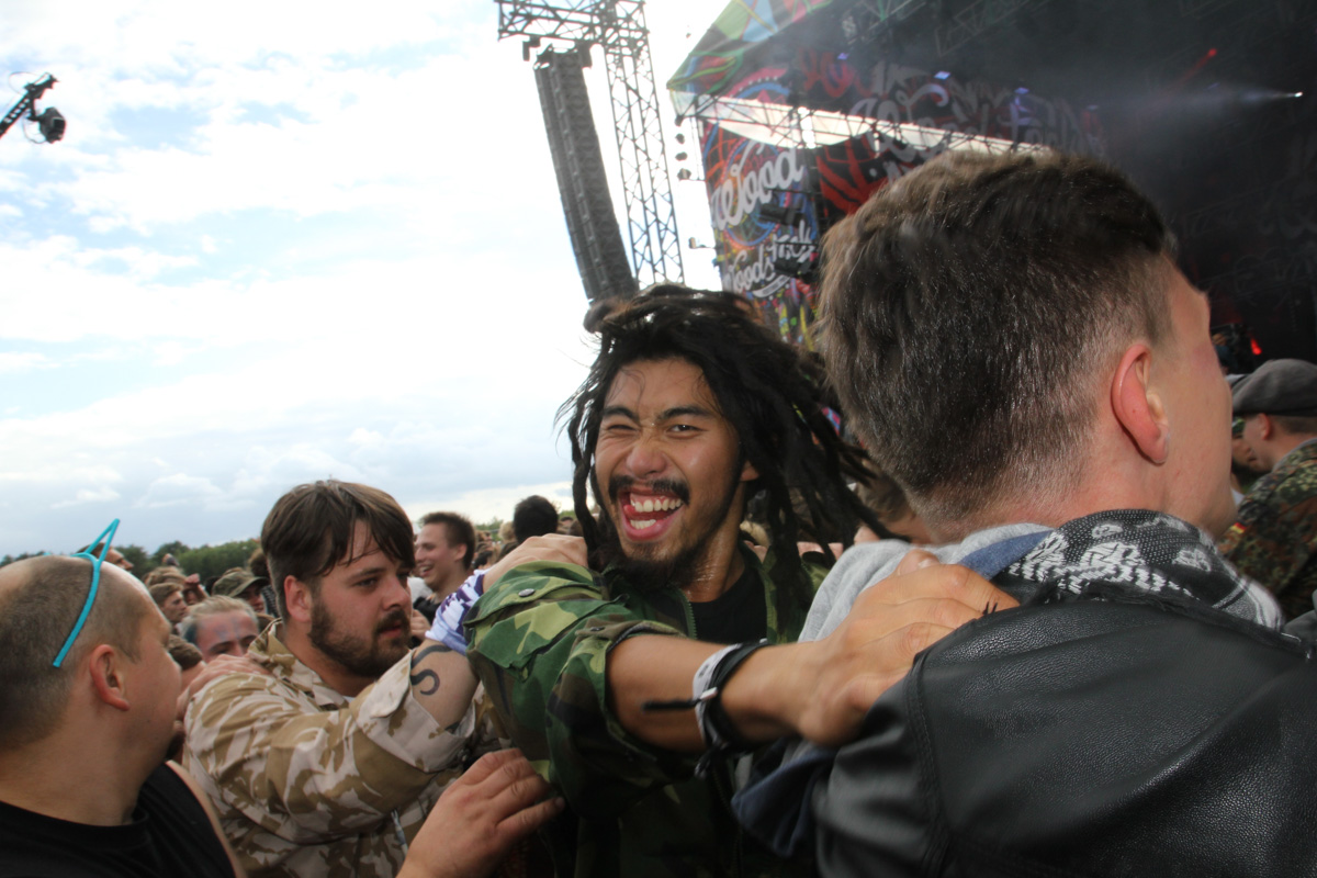 Woodstock是世界上最好的音乐节这没有异议。最躁动的人群在音乐中传递人性本真的爱,不同的文化在和平中互相不断触碰,如果有一天我们失去了所有语言,也许音乐就是沟通世界两头最伟大的桥梁!音乐节第二天傍晚来临之前,第二舞台的中国民族金属乐队“九宝”的演出让台下所有人疯狂碰撞,身体里的新陈代谢最快速的连接到空气。平时更喜欢雷鬼音乐的贝姨说他唯一能听金属乐的平台就是音乐节现场,跳水和pogo让他可以更全面地调动身体细胞感受这种音乐类型。Woodstock的这个第二舞台是两年前贝姨人生第一次跳水的地方,当时他无意中路过舞台上正在演出的波兰著名乐队bublicziki,夕阳下觉得音乐美好,便完成了人生里程碑,而这次九宝的民族自豪感使他又爬上围栏,纵身跳下,被传递到人群中央后紧接着开起火车,继续pogo,一路50分钟的演出持续手舞足蹈。