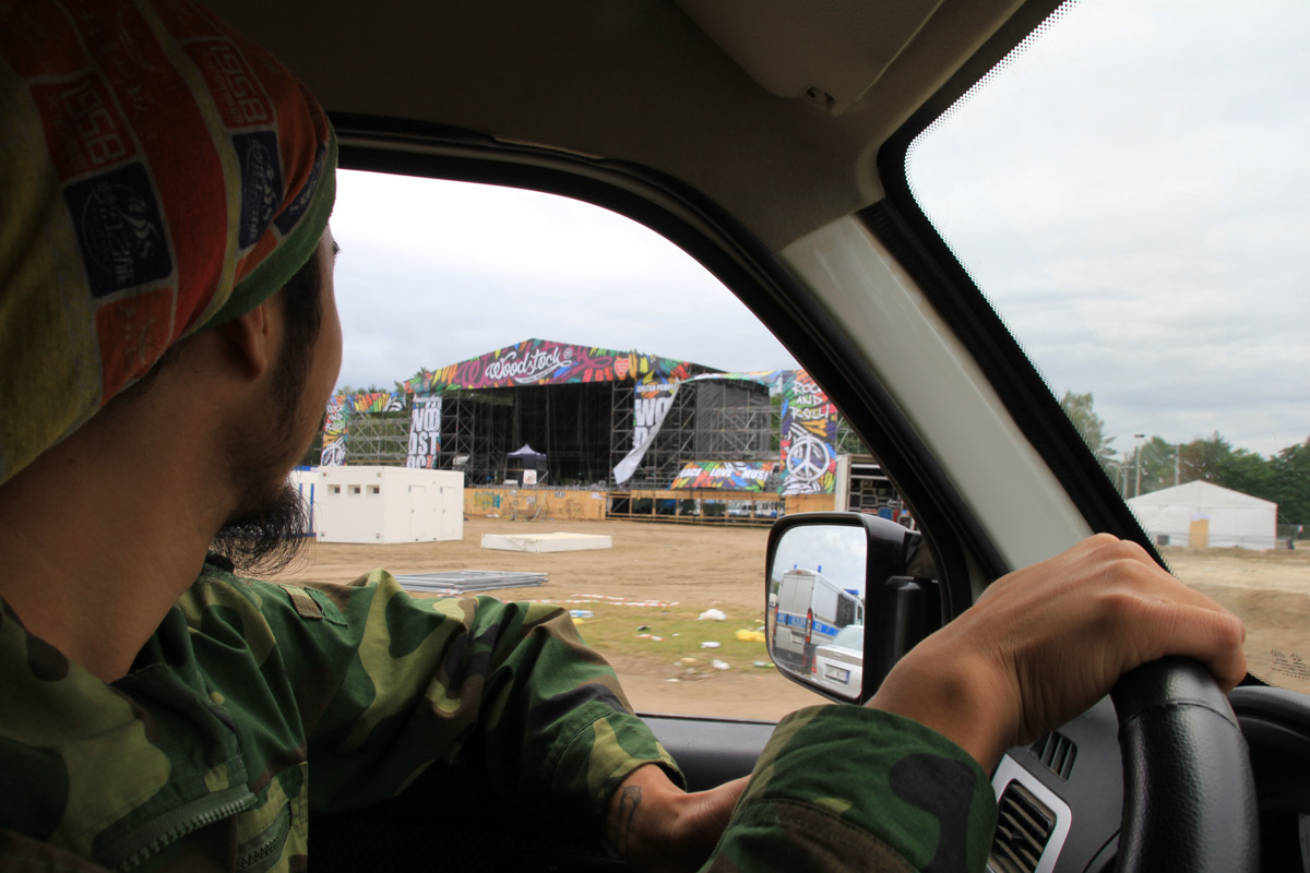 Woodstock音乐节之后贝姨去拜访了老友海尔,在海尔家他们喝着波兰著名的牦牛草伏特加聊到很晚。次日早晨告别后贝姨突然想回到Woodstock现场再看看,因为离得不远,同时正好可以看看狂欢之后的样子。路上加油时还碰到一个眼睛被打肿鼻子还留着血的当地朋克,他面带微笑地与贝姨聊着天,当得知几个年轻人是从中国开面包车过来的时候他激动不已,那时任何事情都比不上友谊带来的力量。 到了现场,50万人留下的狂欢痕迹果然也是一道景观,感觉如果用心,完全可以从整个现场捡出一个家来,从帆布鞋到帐篷,没有开的啤酒到零食,还没有拆完的舞台孤寂地等待服役的结束。