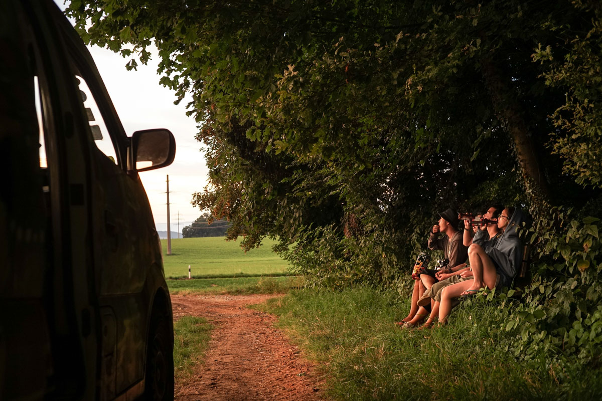 8月18日,傍晚八点,五个变干净了的人往纳沙泰尔湖东南方向行驶了两个小时,依然在瑞士境内。十五的圆月早已在夕阳另外一边的葡萄田上升起,郊外充满泥土的小公路,寂静的农场,惊人的晚霞,又是一个典型的面包车停车时间了。树下一根长椅,打开面包车所有的车窗,所有的门,被拧到最大声的迪丁根城市电台传来完美符合这片土地的交响乐曲,在被火烧云点燃了的玉米田旁,五个人传递着早早储备好的酒,静默地感受这个将要结束的美好白日和紧接着的慢慢来临的又一个夜晚。