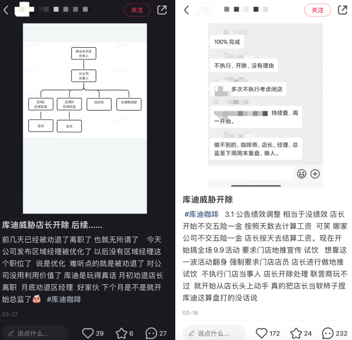 年初,库迪曾以谋求更好的发展为由开展过一轮内部优化,但从小红书上部分店长主动揭露的“被库迪威胁开除”、“一个人做五个人的活仍到手3000”的现象看,所谓的优化,似乎是在朝店长“开刀”。
