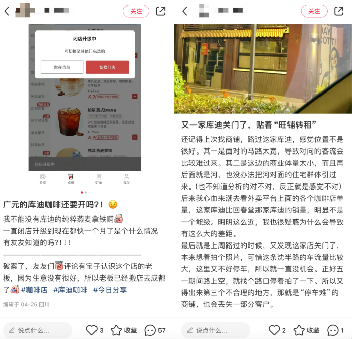 一位四川的网友表示附近的库迪已经闭店升级一个月了,之后才得知老板因生意不好已经搬店了。另有浙江的网友也发帖称,此前路过的一家库迪门店已经因销量不佳贴上了“旺铺转租”标识。