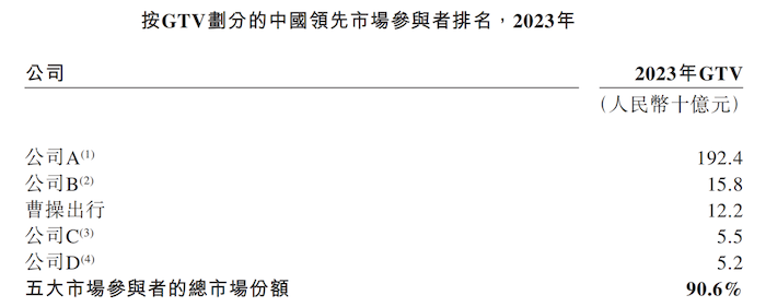 中国出行市场规模稳步扩大,2023年市场规模达到了75000亿元,其中共享出行服务市场规模为2821亿元,渗透率为3.8%。目前来看,网约车市场格局已经形成了由一名市场参与者主导的局面,即滴滴打车以75.5%的市场份额稳坐行业头把交椅,而前五大参与者共占据了90.6%的市场份额,按照GTV计,曹操出行2023年位居第三。