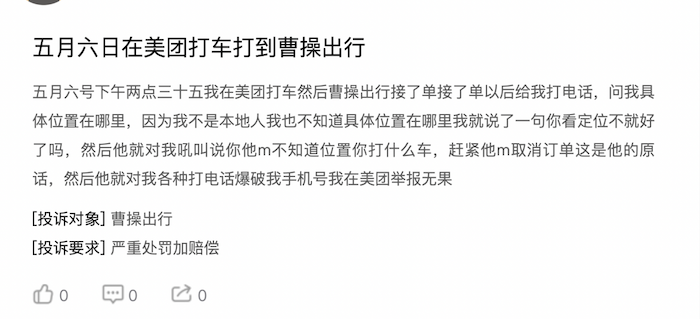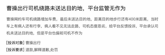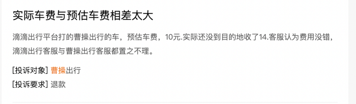除此之外,聚合平台上关于曹操出行的投诉也有不少。界面新闻记者注意到,滴滴出行此前就加入了“聚合模式”,平台上汇聚了包括曹操出行、阳光出行等第三方品牌。然而,有不少网友反映,在使用滴滴平台打车时,在不知情的情况下,平台默认或“偷偷”地将订单分配给了曹操出行等第三方服务,导致最终的车费相比直接选择滴滴自营服务时贵了近一倍。
