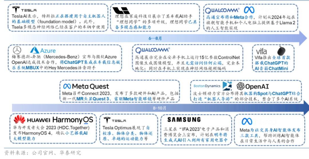 2023年初,在巴塞罗那举行的MWC世界移动通信大会上,期间荣耀发布了魔法OS 8.0、魔法大模型、Magic6 Pro手机等产品;高通和联发科展示了更多AI能力的芯片。同年,三星、vivo、OPPO、荣耀、华为、小米等手机厂商开始将大模型能力应用在手机产品上,AI手机加速渗透。
