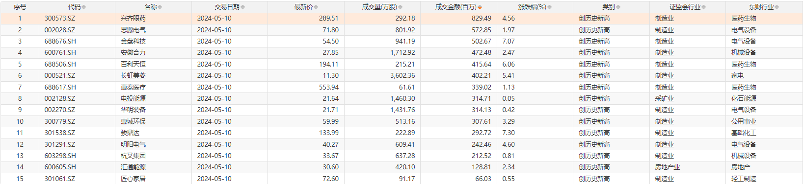 5月10日,Choice数据统计,今日共有15只个股股价创历史新高,主要分布在电气设备、医药生物等行业,包括兴齐眼药、安徽合力、思源电气、长虹美菱等。