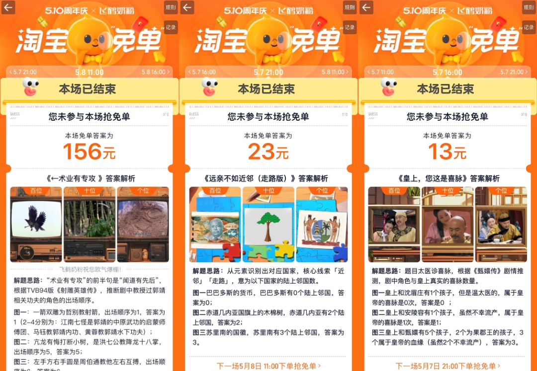 锌刻度了解到,淘宝免单活动从5月6日持续到5月8日,不同时段的免单活动会出不同题目,用户根据图片猜测免单金额的范围,然后再下单相应产品,就有机会拿免单名额。