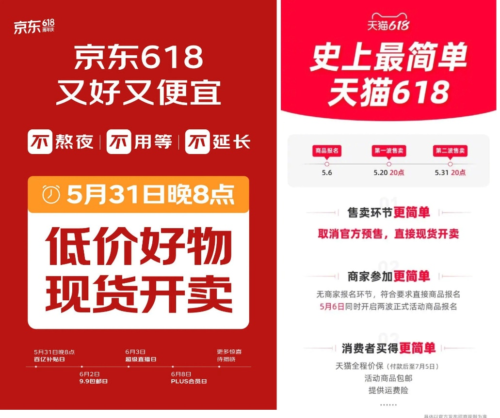 或许正因为看到了来自多方的不满,今年618大促前,淘宝、京东不约而同地宣布取消预售机制。其中淘宝招商文件显示,取消预售的淘宝将618活动提前到了4月下旬,其中4月下旬到5月中旬为“前站”,5月中下旬进入618第一波,5月31日晚上八点到6月20日是第二波。