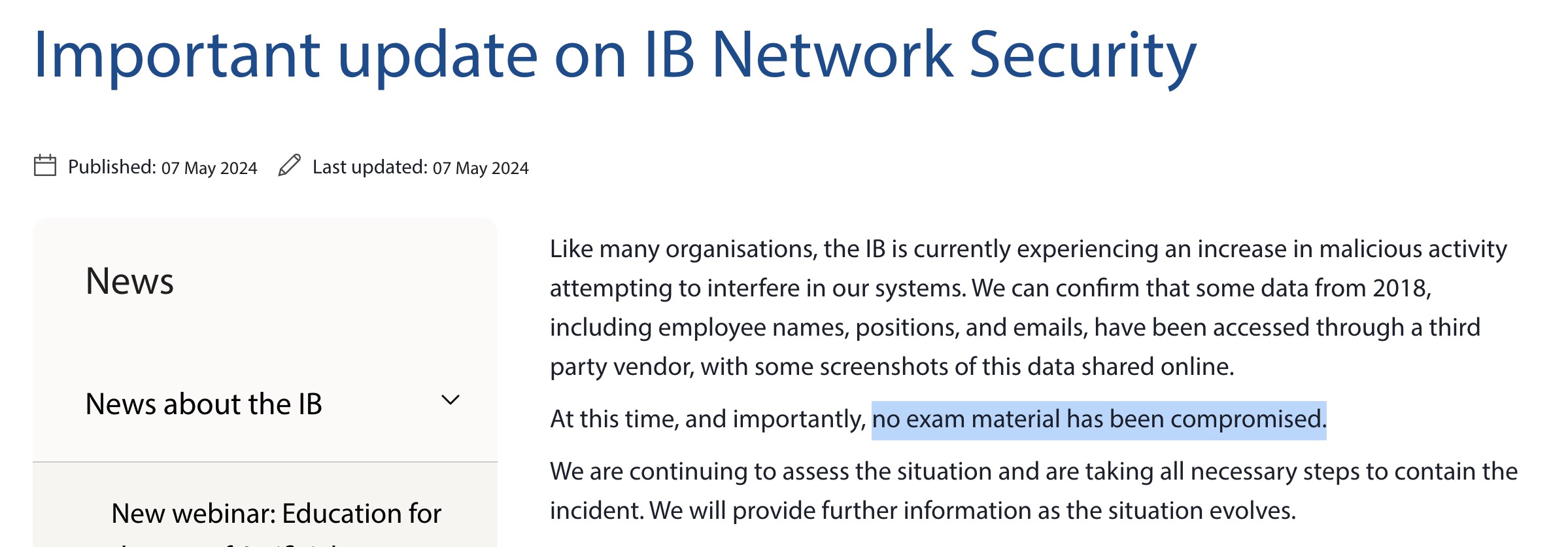 5月7日,IBO就黑客入侵发布声明称:“像许多组织一样,IB目前正在经历试图干扰我们系统的恶意活动。”