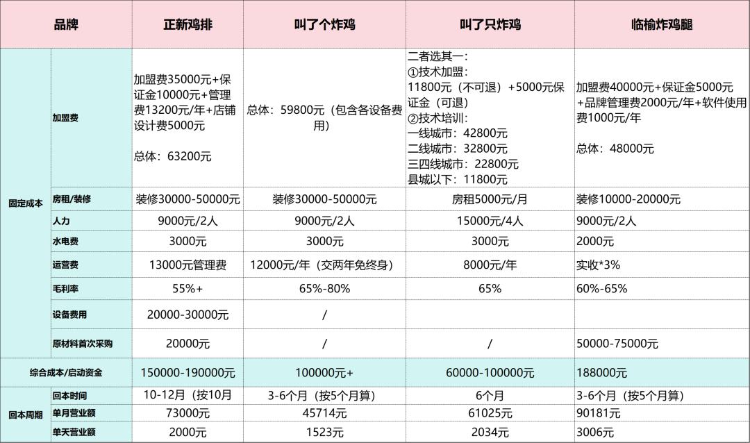 《真故研究室》基于正新鸡排、临榆炸鸡腿、叫了个炸鸡、叫了只炸鸡四家市场公开信息,制作了一张图,呈现它们的加盟成本和回报周期。