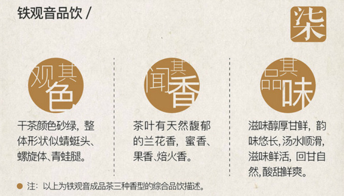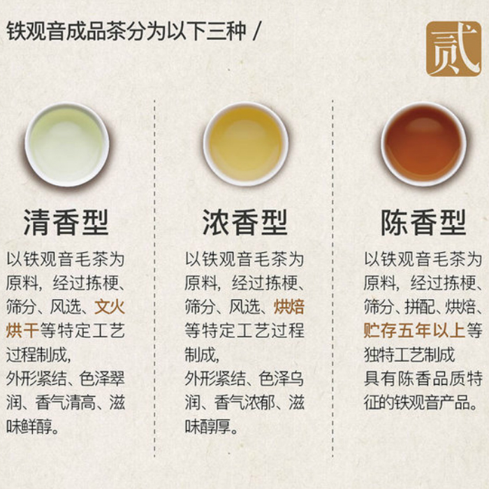 浓香型:以铁观音毛茶为原料,经过拣梗、筛分、风选、烘焙等特定工艺过程制成,外形紧结、色泽乌润、香气浓郁、滋味醇厚。