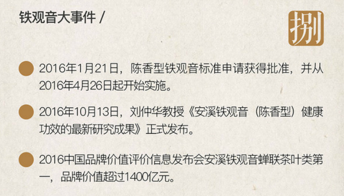 1、2016年1月21日,陈香型铁观音标准申请获得批准,并从2016年4月26日起开始实施。