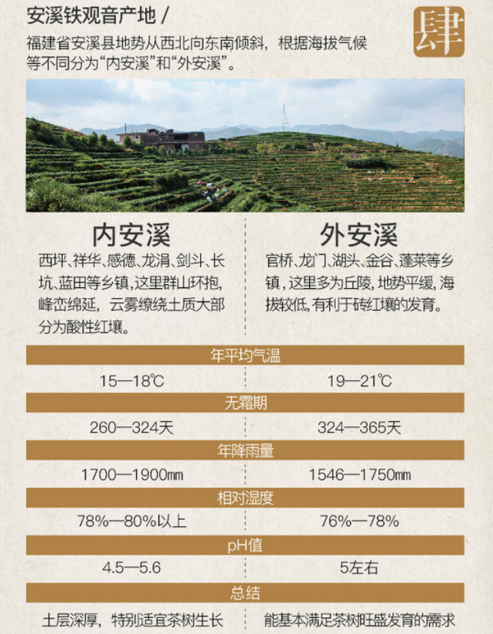 安溪铁观音的产地福建省安溪县地势从西北向东南倾斜,根据海拔气候等不同分为“内安溪”和“外安溪”。内安溪位于西部,以山地为主,层峦叠嶂,最高峰海拔达1600米;外安溪位于东部,以丘陵为主。安溪全境都有产茶,有感德香,祥华味,西坪韵的说法。