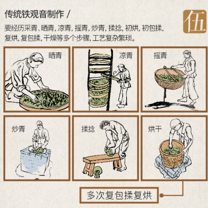 传统铁观音的制作要经历采青、晒青,凉青,摇青,炒青,揉捻,初烘,初包揉,复烘,复包揉,干燥等多个步骤,工艺复杂繁琐。根据制作成品的香型不同,制作过程也会有些许不同,以下是铁观音的主要制作过程。