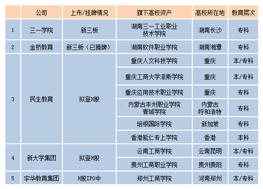 2016年8月到9月间,宇华教育、新大学集团、民生教育3家中国内地教育公司先后申请在香港上市的消息引人注目,而这三家公司业务中都包含高等教育。其中新大学集团主要经营的就是高等学历教育服务,还计划在美国加利福利亚州成立高等教育机构。在登陆资本市场后,智能化、国际化的高等教育服务产业将获得新契机。