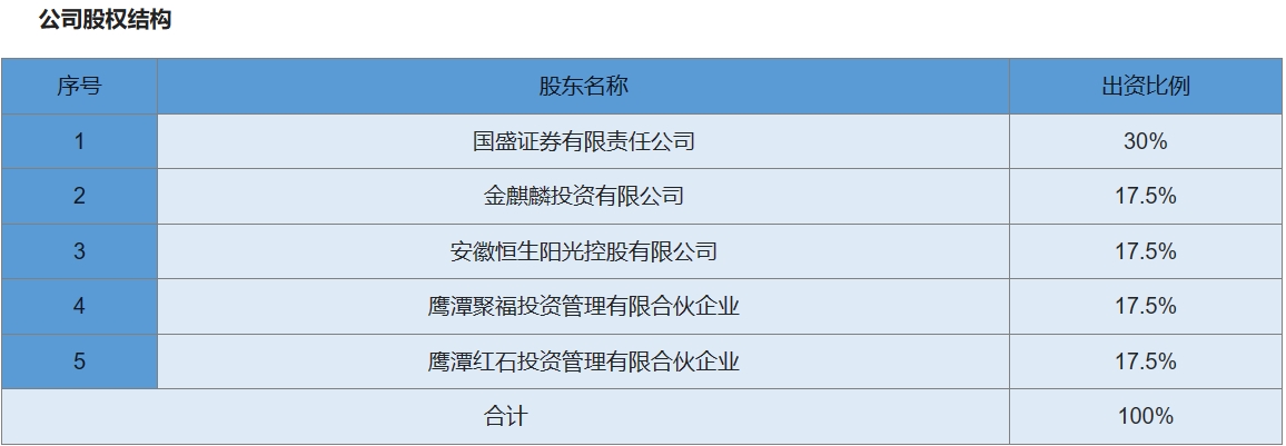 公开资料显示,江信基金于2013年1月28日注册成立,注册地在北京市,注册资本1.8亿元人民币。从股权结构来看,国盛证券为第一大股东,持股占比为30%,金麒麟投资有限公司、安徽恒生阳光控股有限公司、鹰潭聚福投资管理有限合伙企业、鹰潭红石投资管理有限公司合伙企业分别占比为17.5%。该公司没有实际控制人。