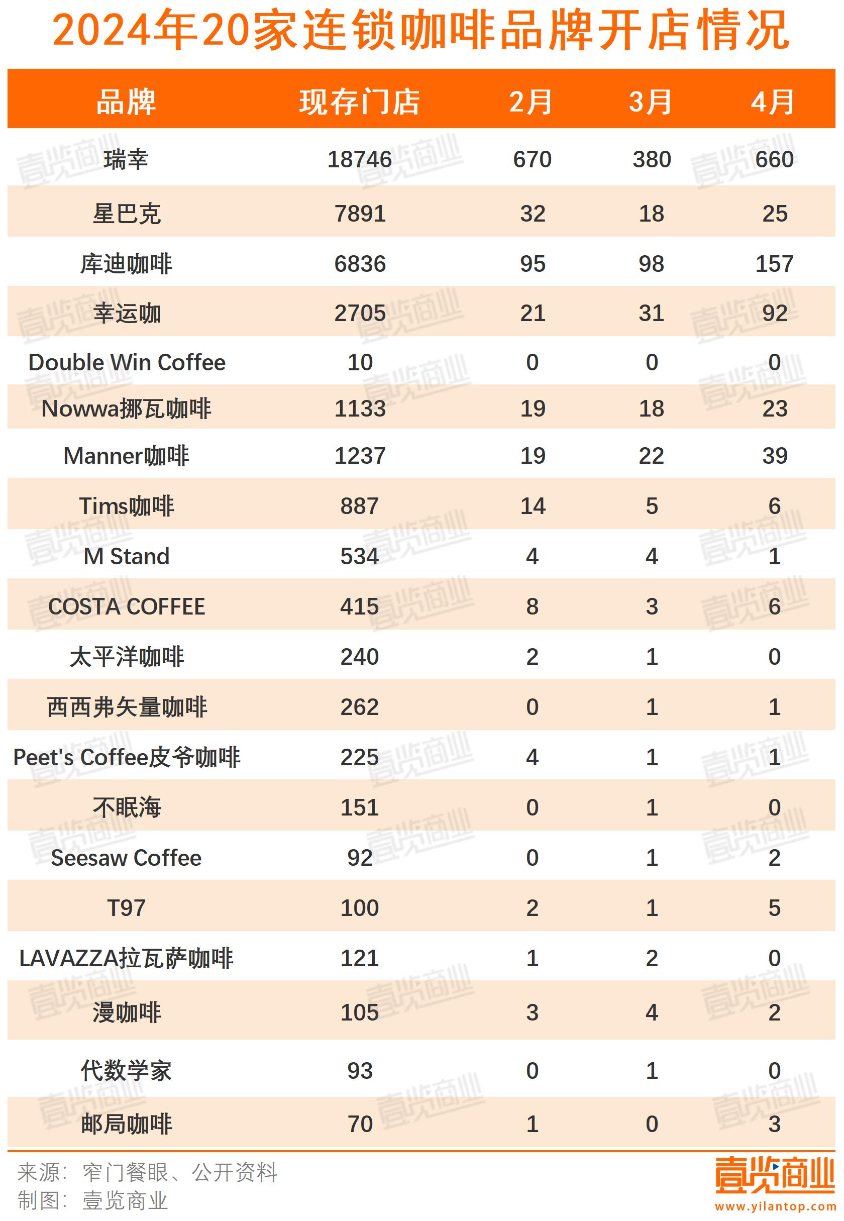 据壹览商业不完全统计,20家连锁咖啡品牌4月份新开门店1023家,同比2023年2月上升8.83%,环比2024年3月上升72.8%,门店总数达41583家。