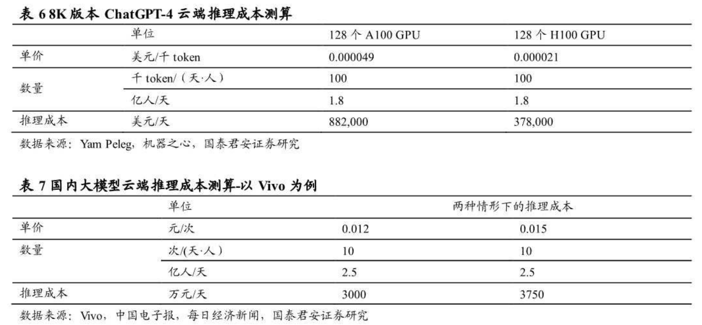 算法交易公司Deep Trading的创始人Yam Peleg曾算过一笔账,8K版本的ChatGPT云端推理成本为0.0049美分/千token(128个A100 GPU)。以全球1.8亿日活跃用户、每人每天100千token推理需求测算,ChatGPT4在云端进行推理的成本约为88.2万美元/天。