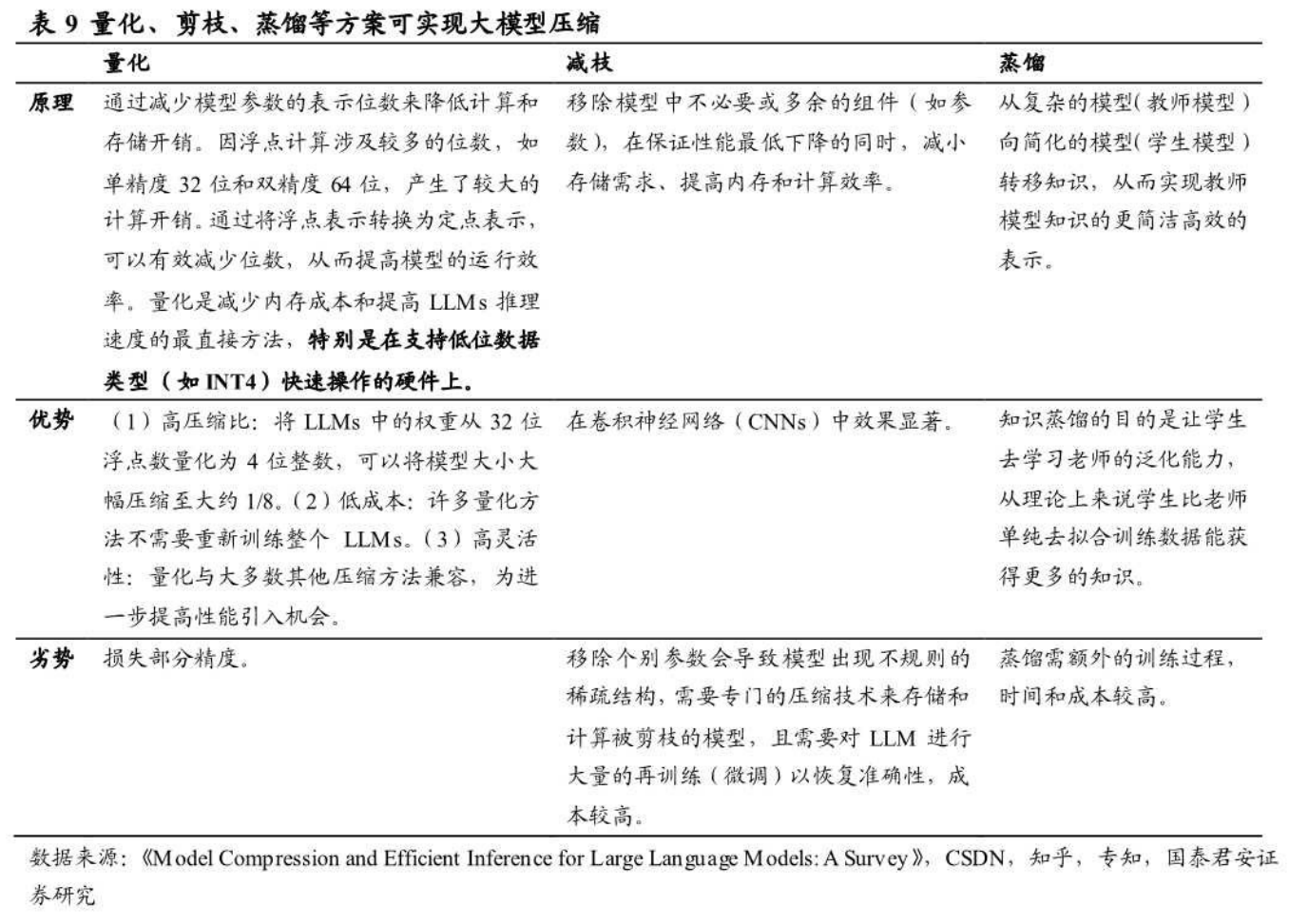 首先来看规模化最多的大模型压缩,主要包括量化、剪枝及蒸馏等几种方案。