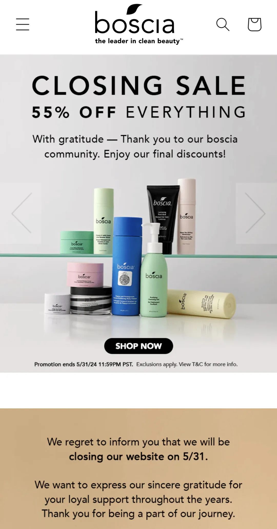 近日,日本FANCL旗下纯素护肤品牌Boscia博倩叶官网发布最终清仓公告:全场商品55折,并将于5月31日停止促销。公告称:“我们很遗憾地通知您,Boscia将于5月31日关停网站。我们对您多年来的支持表示由衷的感谢。”