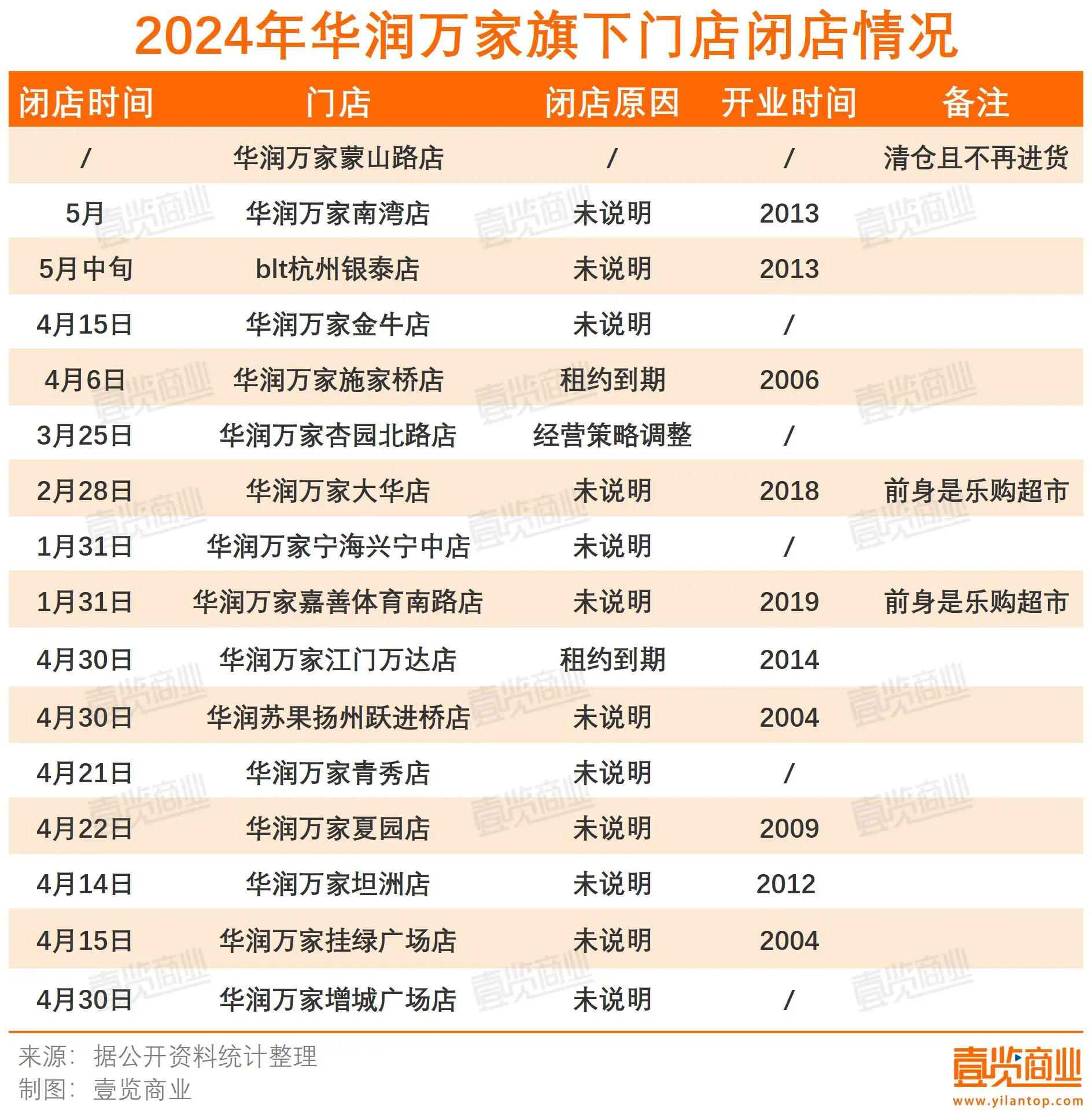 实际上,华润万家也意识到了这一情况,开始闭店调整业务。据壹览商业不完全统计,今年以来,华润万家至少关闭了13家门店,且这个数字仍在上升。