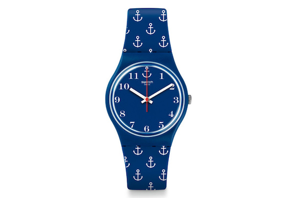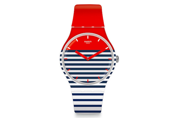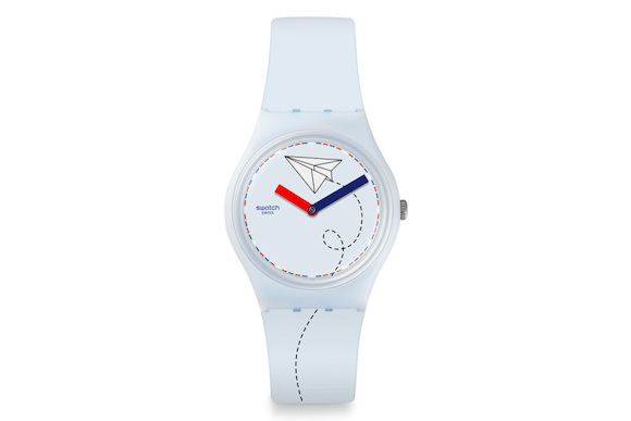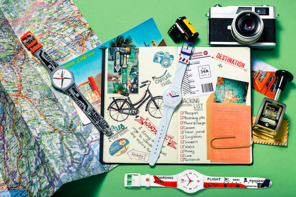 这一季,Swatch手表以旅行为主题。表盘上,不仅有纸飞机、机场登机信息,还有船锚、绳索等航海元素,而代表度假气氛的横条纹图案也有体现。