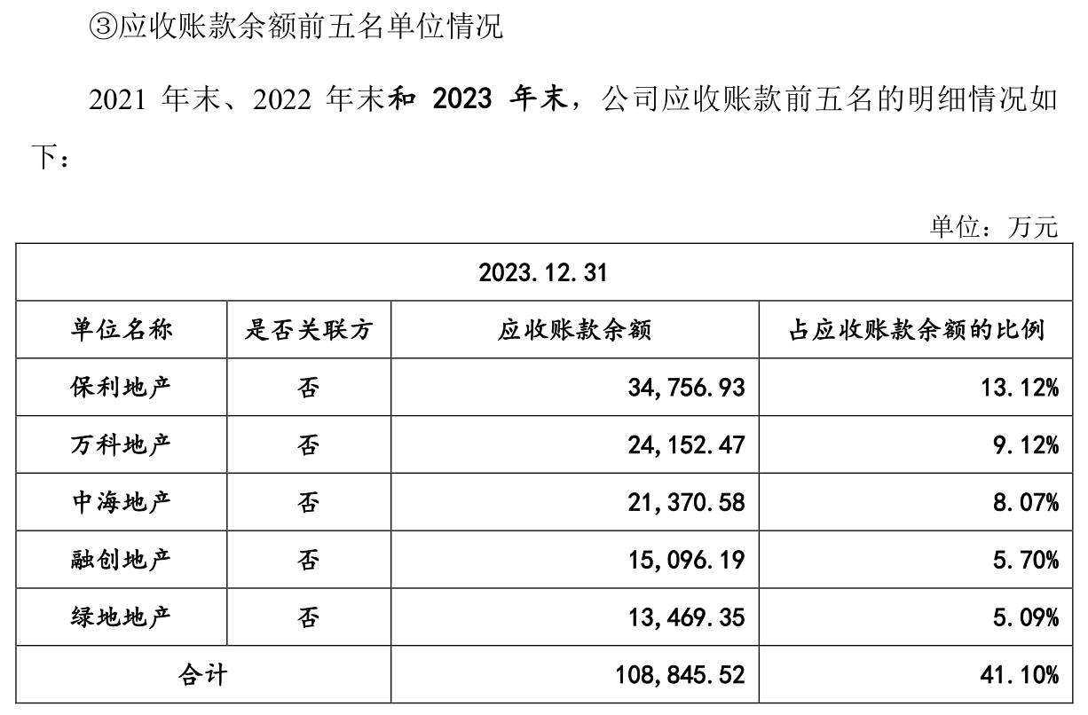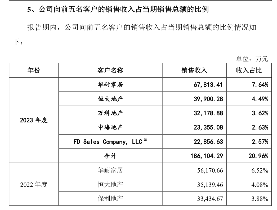由于行业所属,马可波罗也要看房地产行业的阴晴。从2023年前五客户可知,公司前四都是地产企业,且恒大地产仍是第二大客户。前五客户的销售收入占比为20.96%。