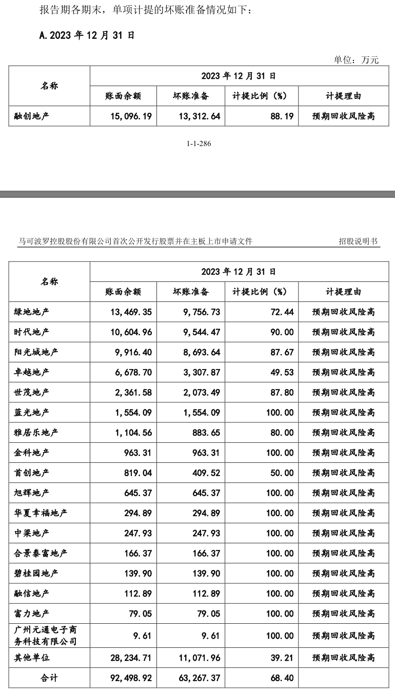 在应收账款计提方面,从2023年单项计提的坏账准备情况就可以看到,因“预期回收风险高”计提的大多地产公司,最大的单项坏账准备就来自融创地产。