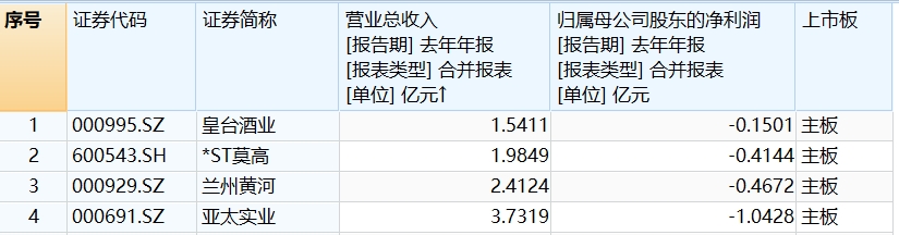 甘肃板块有皇台酒业(000995.SZ)、*ST莫高(600543.SH)、兰州黄河(000929.SZ)三家公司2023年营收规模不足3亿元,且归母净利润为净亏损状态。这三家企业均为酒企,皇台酒业和*ST莫高均位于甘肃省武威市。