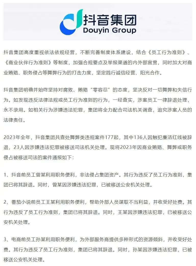 字节跳动企业纪律与职业道德委员会的通报,再次显示其“对内部腐败零容忍”的态度,向外界清晰传达了反腐的决心。而此次反腐行动共涉及61起违法违纪案件,所有涉事员工均被公司毫不姑息地辞退。其中,有4名员工因行为涉嫌构成刑事犯罪,已被公安机关正式立案侦查。