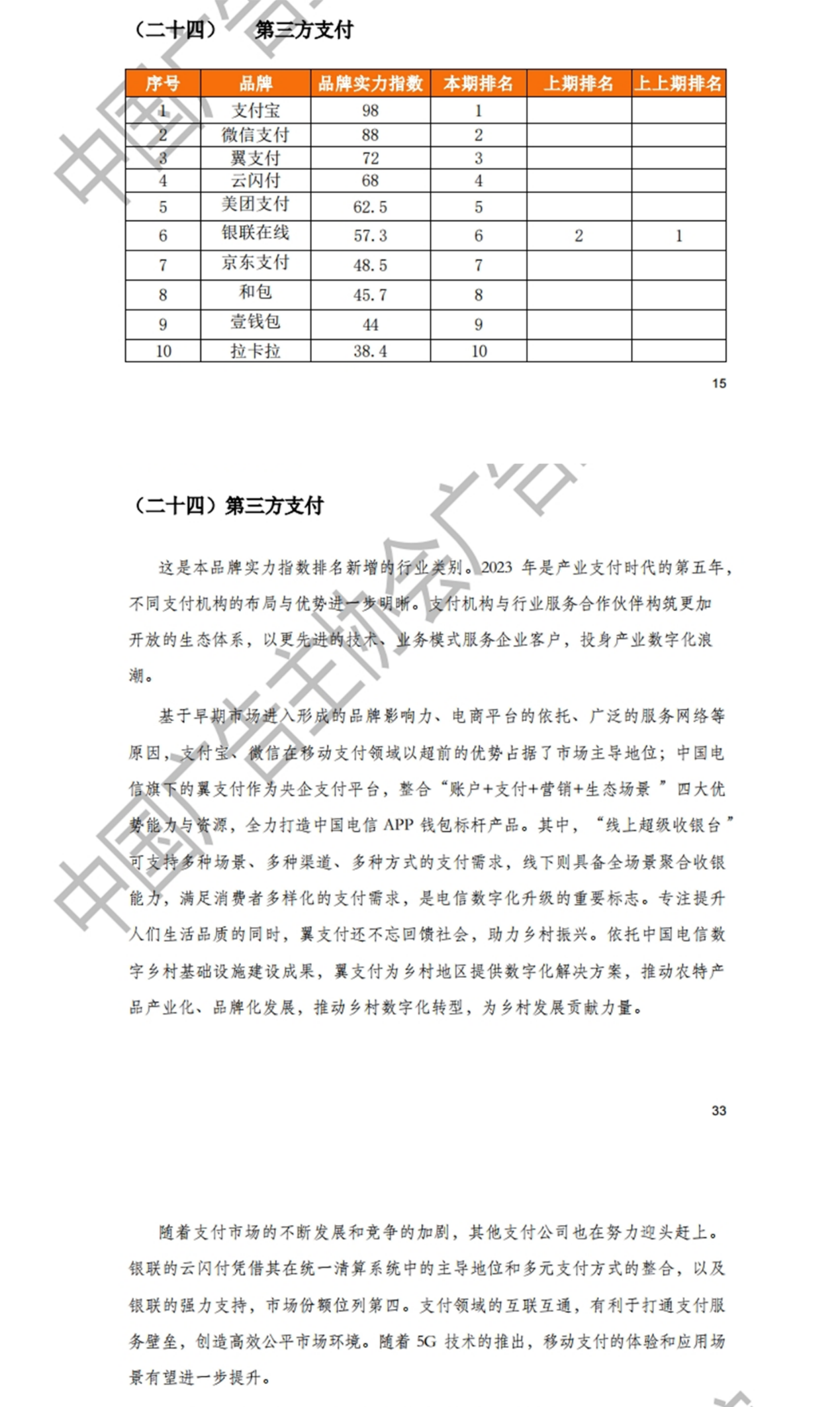 论坛上,中国广告主协会发布了《2024中国品牌发展实力指数报告》,中国电信翼支付凭借在移动支付领域的优异表现,位列第三方支付类企业第三。