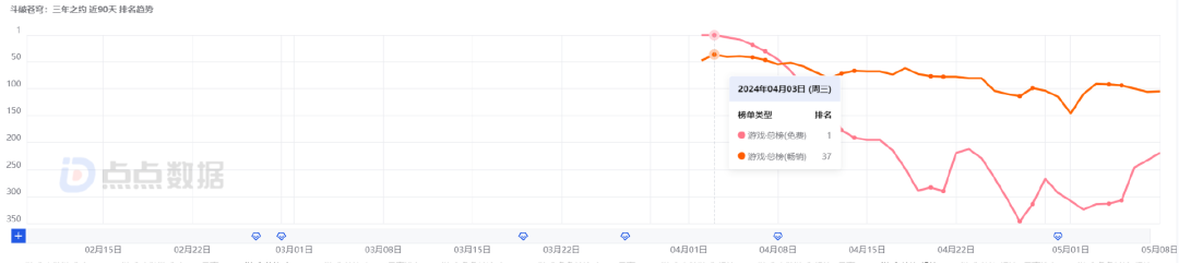 点点数据显示,《斗破苍穹:三年之约》上线当天登顶iOS游戏免费榜,并且截至4月6日仍保持在TOP20以内。在iOS畅销榜中,最高排名第37名。