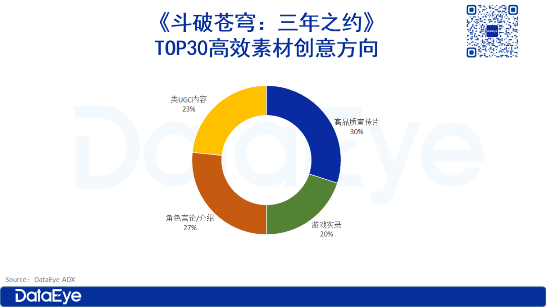DataEye研究院整理了《斗破苍穹:三年之约》投放计划数TOP30的高效素材,其投放素材创意形式中,高品质宣传片占比较高,占比约为30%,其次则是角色言论/介绍,占比约为27%,再是类UGC内容,占比23%,最后是,游戏实录占比20%。