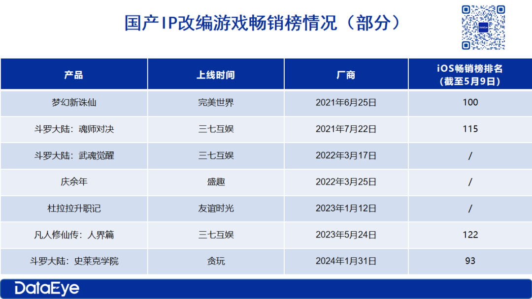 DataEye研究院总结了近几年国产IP改编游戏畅销榜情况,有几款游戏已经掉出畅销榜了,还在榜单上的也处于百名左右,其中三款都是“斗罗大陆”IP,归根结底,在于这个IP,确实能打,并且同类产品的氪度都中上。