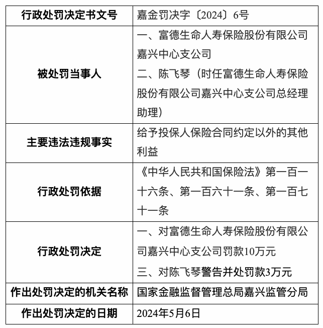 5月13日,国家金融监督管理总局嘉兴监管分局行政处罚信息公开表显示,2024年5月6日,富德生命人寿保险股份有限公司嘉兴中心支公司因给予投保人保险合同约定以外的其他利益,被处罚款10万元。
