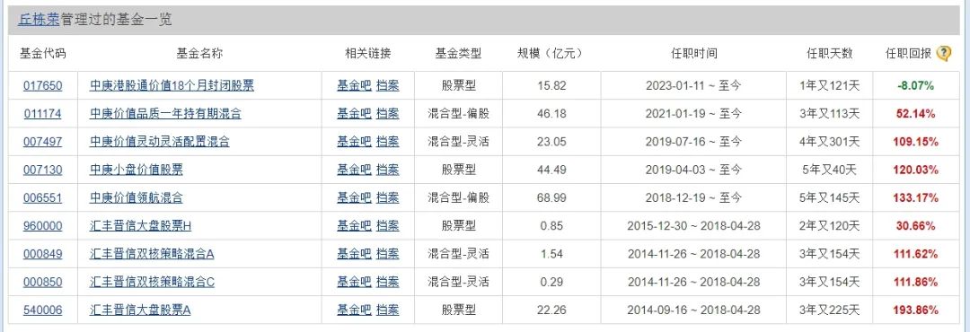 在进入中庚基金之前,丘栋荣在汇丰晋信基金任基金经理,在任期间,其管理的4只基金(各类分开计算)皆取得较为不错的超额收益,其中,汇丰晋信大盘股票A类基金的任职回报更是将近200%。