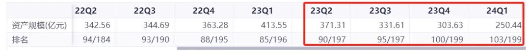 其行业排名自2023年以来也持续走低,已从2023年一季度末的85|196,降至2024年一季度末的103|199。