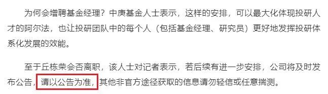 面对市场传闻,中庚基金并未直接回应是否准确,只强调“以公告为准”。