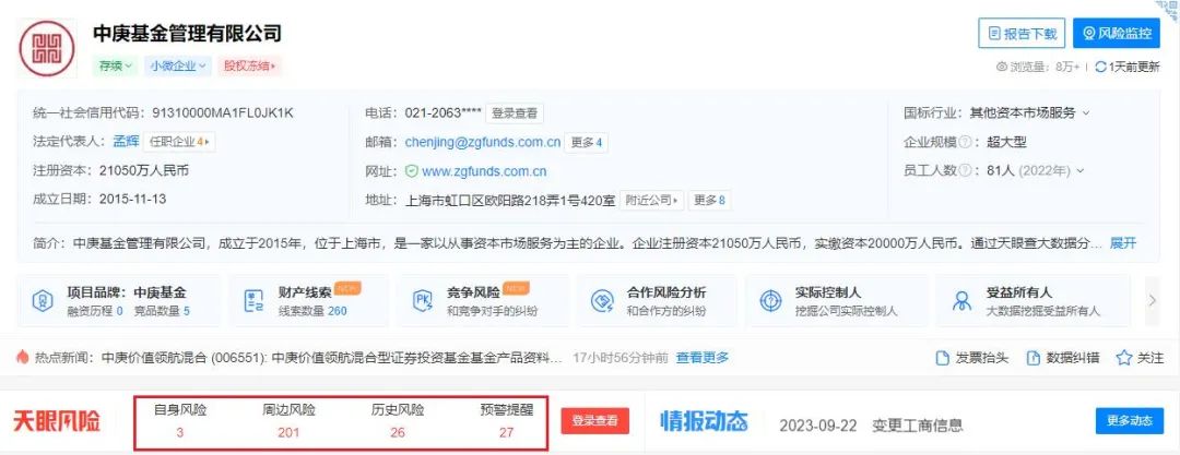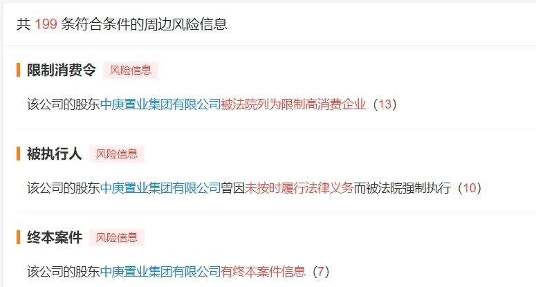 天眼查显示,中庚基金目前有近200条周边风险,其中不少来自第二大股东中庚置业,涉及被法院列为限制高消费企业、未按时履行法律义务被法院强制执行等类目。