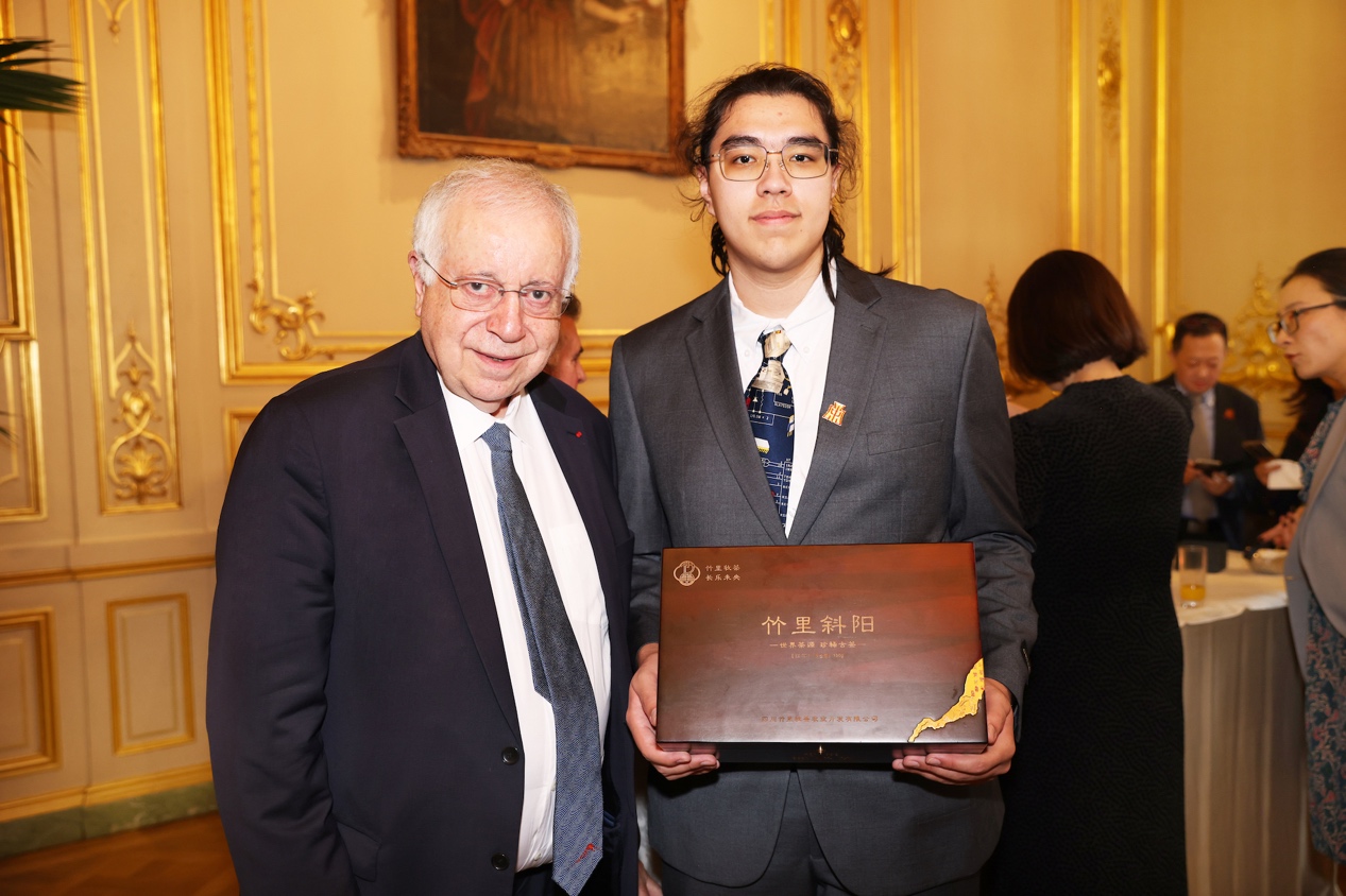 在晚宴助力中法文化交流的慈善拍卖上,四川竹里牧茶农业开发有限公司捐赠,采自约1200年古老乔木茶树、并严遵古法工艺制作的200克瓷罐装崇州枇杷茶“竹里斜阳”,经过多轮激烈竞拍,最终由法国巴黎法中友协名誉主席、法兰西人文科学院副院长、法国美食文化遗产使团主席毕特院士(Jean-Robert PITTE),以3.1万欧元的惊人价格拍下。他表示在品鉴时就深深爱上了这款茶,喝的时候仿佛是在欣赏一副历史悠久的画卷,又像是在品味一首美妙的诗歌。他自购茶品,不单是为了满足自己的味蕾,更希望能推进法中友谊,促进文明交流互鉴。