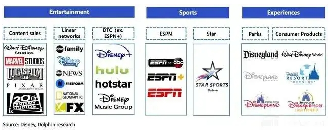 从业务层面来看,迪士尼分成了娱乐(Entertainment)、体验(Experiences)、体育(Sports)三大板块。