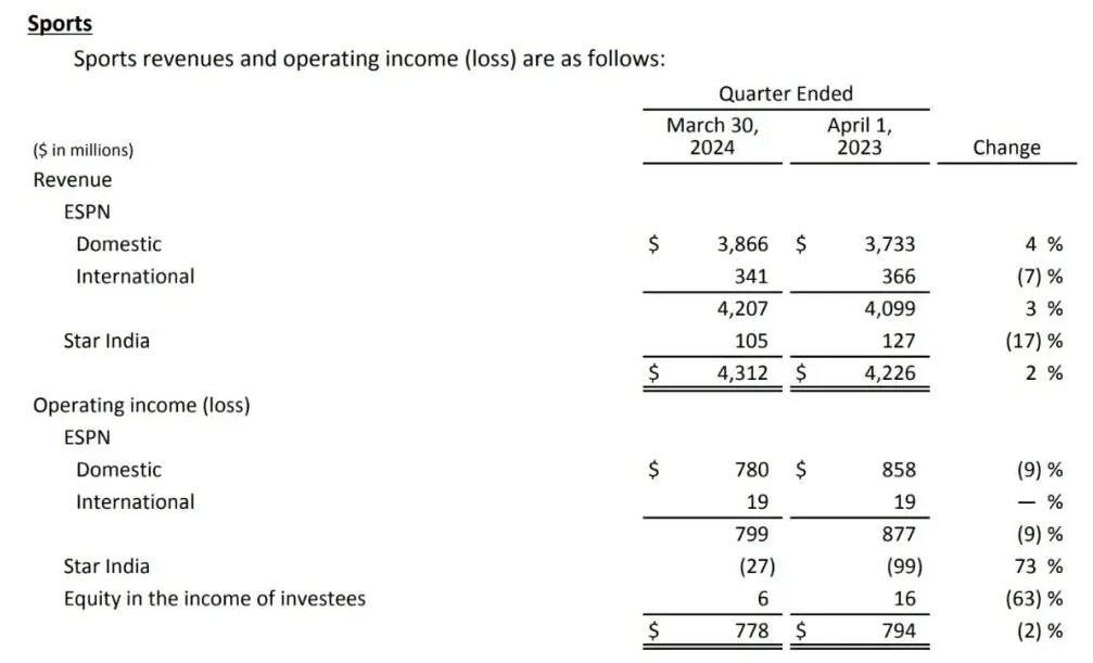 「体育板块」的收入增长2%至43.12亿美元,包括ESPN、有线电视频道和「ESPN+」等流媒体服务。报告期内,该板块利润降低2%约为7.78亿美元,原因是大学橄榄球赛事内容成本上升。此外,ESPN收入增长3%至42.07亿美元,而Star India则由于失去了印度的板球赛事版权,收入下降17.3%。