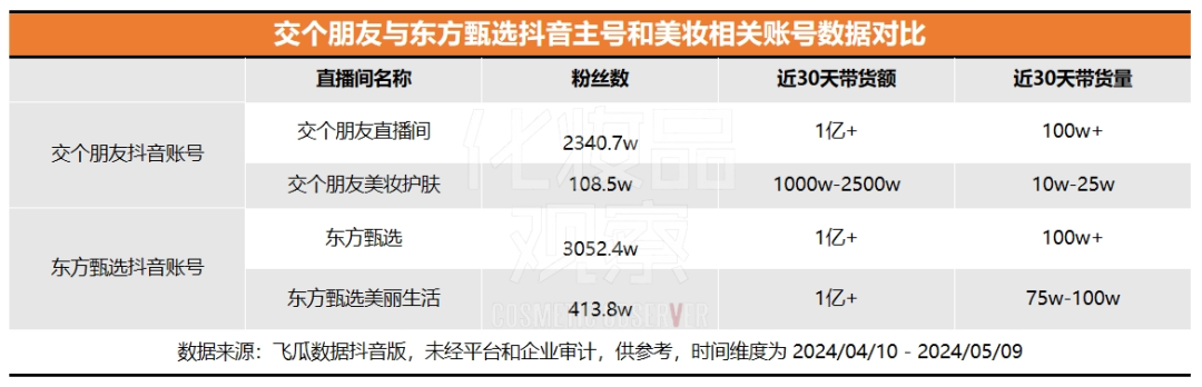 东方甄选在抖音平台聚焦美妆的账号东方甄选美丽生活,同样表现不俗。据飞瓜数据抖音版,这一账号目前拥有粉丝数413.8万,近30天带货美妆的GMV为1000w-2500w,今年一季度带货美妆的GMV为1亿+。