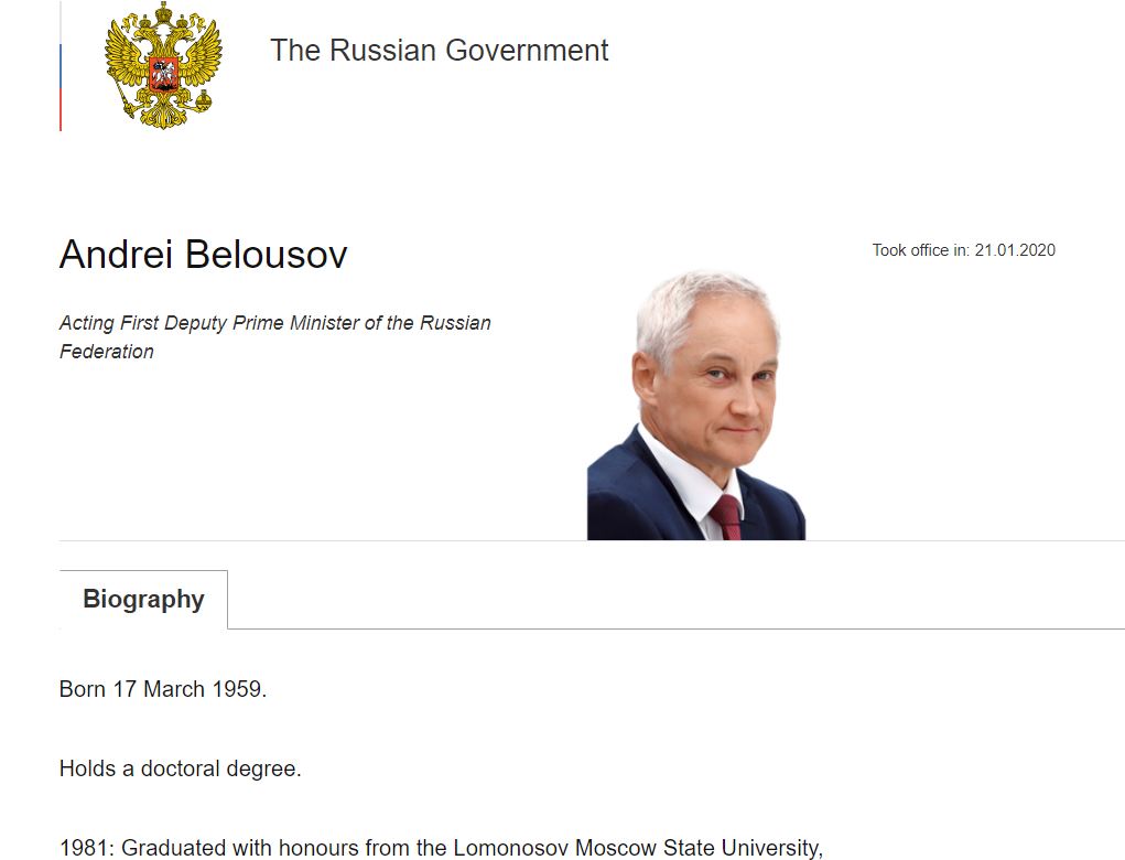 现年65岁的别洛乌索夫则毫无军旅经历,步入政坛前一直在学术界工作。他拥有莫斯科国立罗蒙诺索夫大学经济学博士学位,毕业后进入苏联科学院中央经济数学研究所从事研究。苏联科学院改为俄罗斯科学院后,别洛乌索夫担任宏观经济分析和短期预测中心主任。