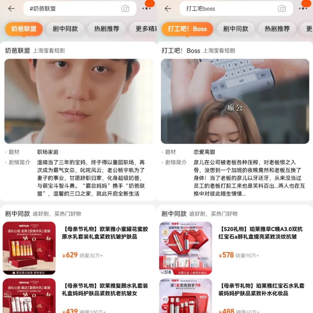 而到了今年618大战之前,淘宝又上线了巴黎欧莱雅赞助短剧《奶爸联盟》、珀莱雅赞助短剧《打工吧!boss》等定制内容,喊出“好看又好买”的口号,进一步用“定制短剧”打开品牌方们的预算阀门。