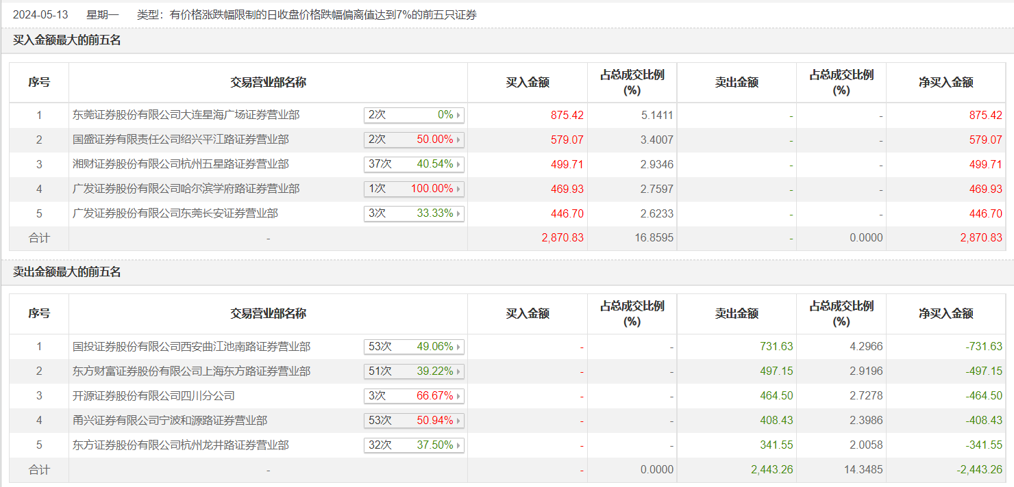 康惠制药5月13日跌停,龙虎榜数据显示,上榜营业部席位全天成交5314.09万元,占当日总成交金额比例为31.21%。其中,买入金额为2870.83万元,卖出金额为2443.26万元,合计净买入427.57万元。